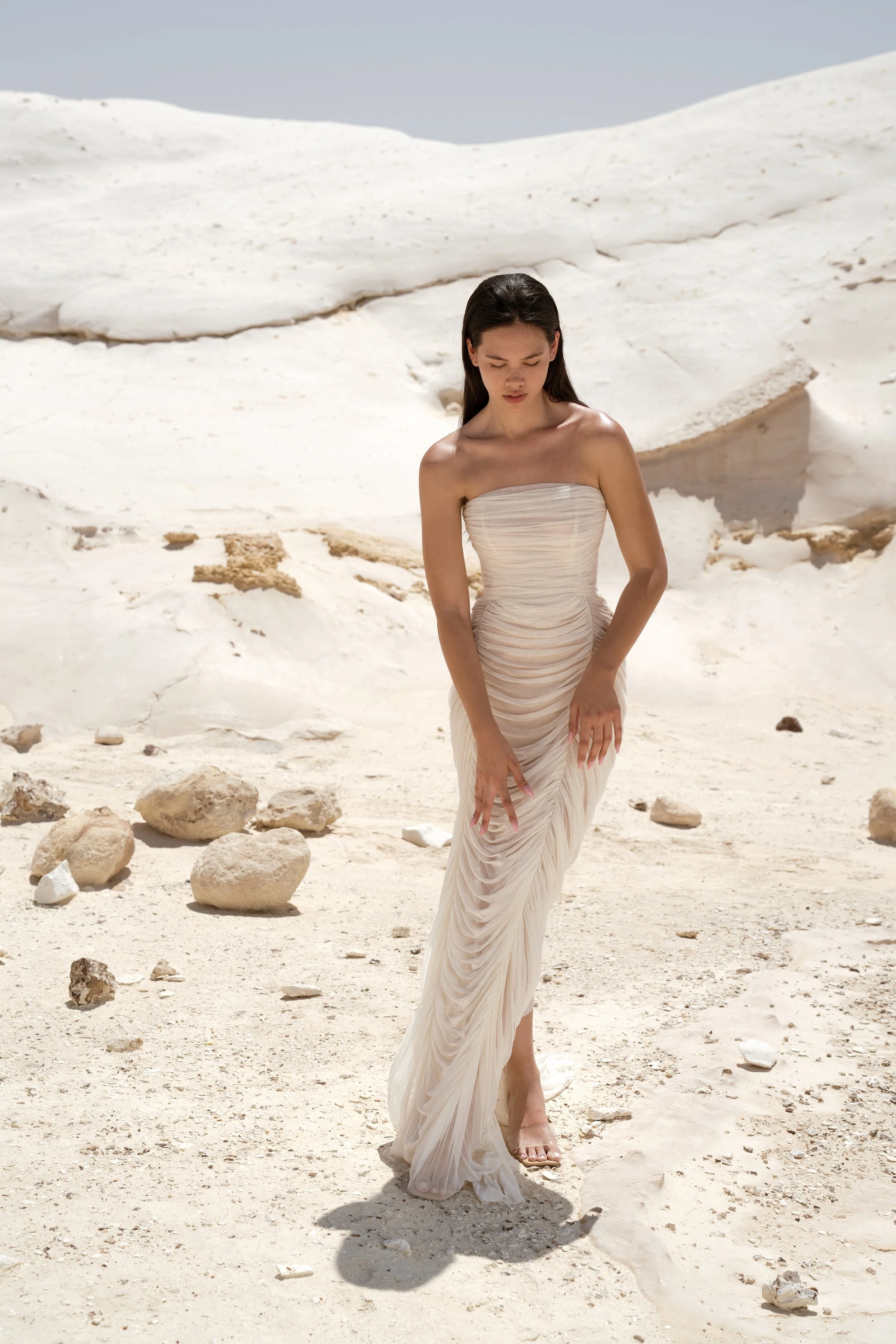 Draped pleating silk dress, meticulously draped pleating, for a waterfall effect that pools into an opulent train.