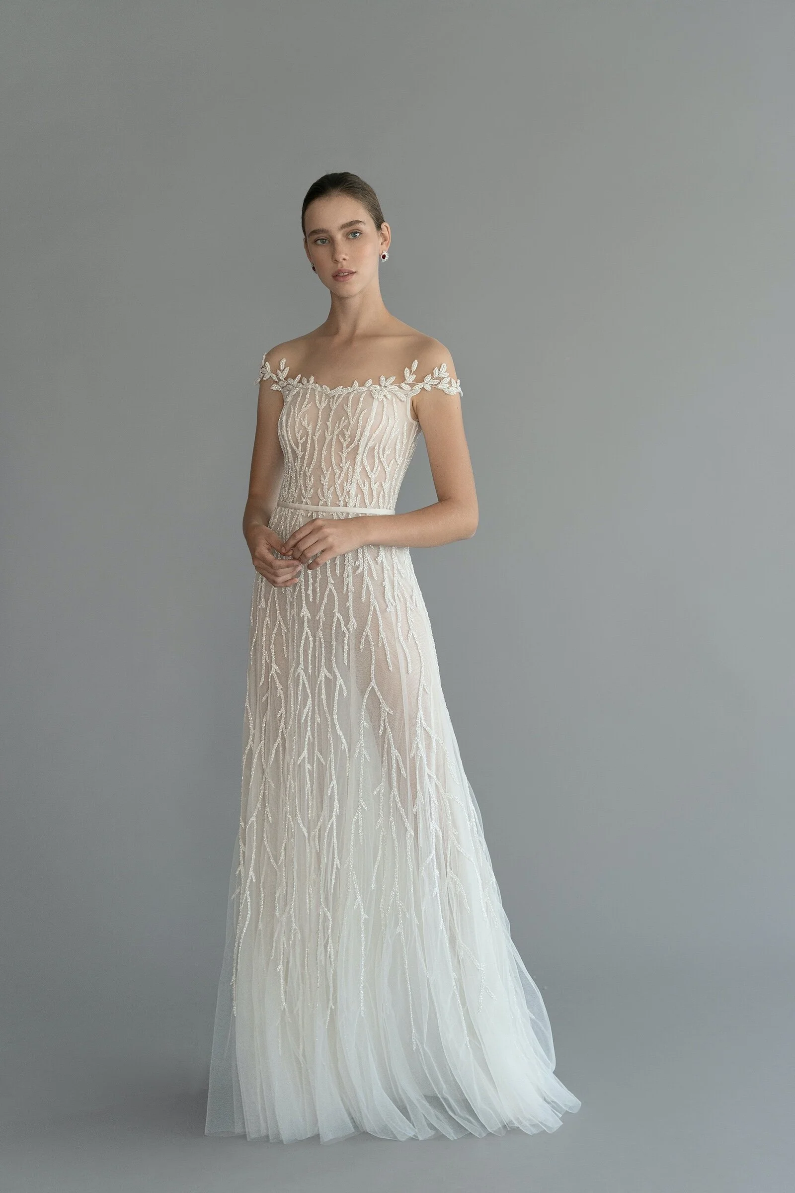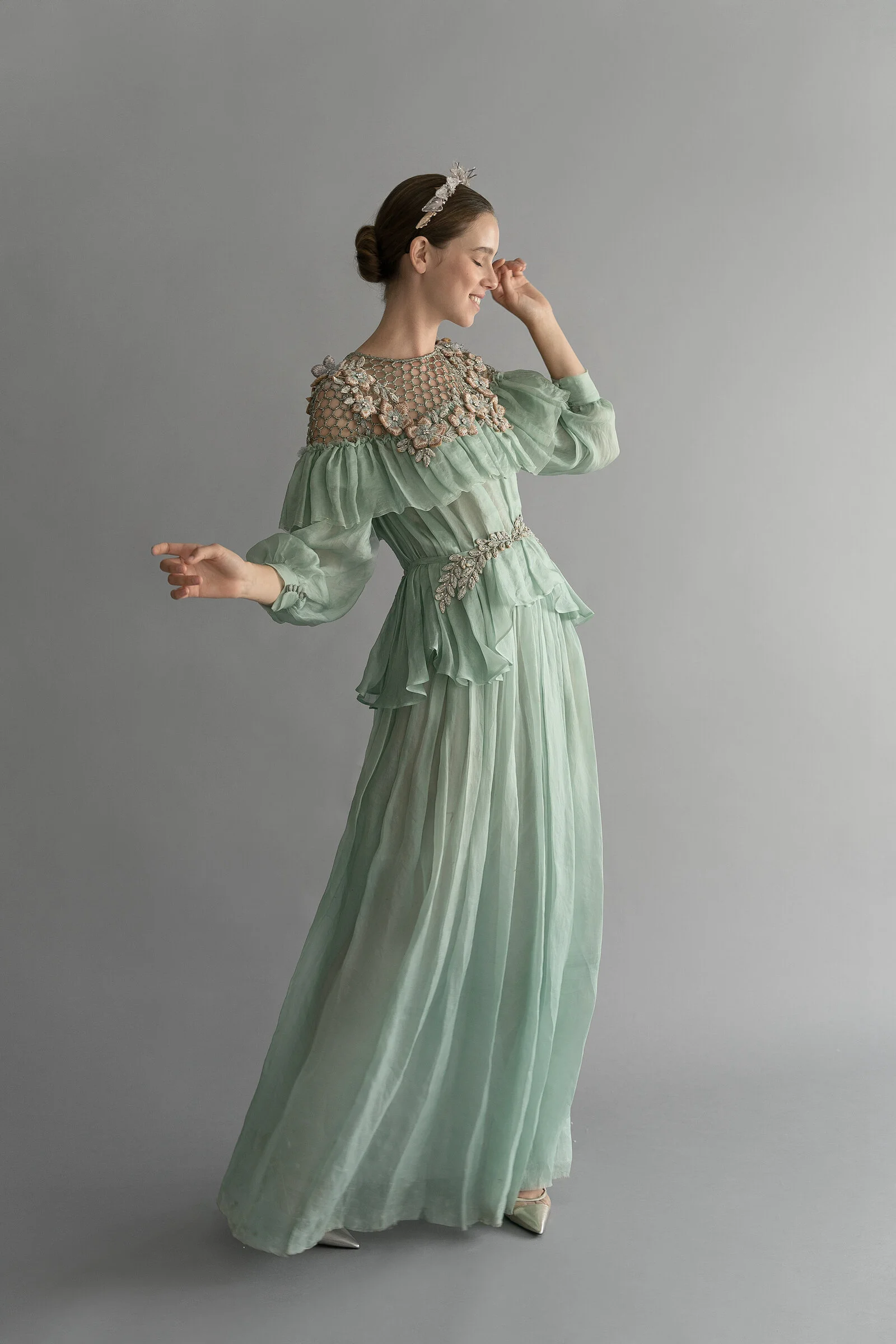 F/W 2020 Featherweight silks, off the shoulder floral motifs, delicate embroideries on a range of silhouettes.