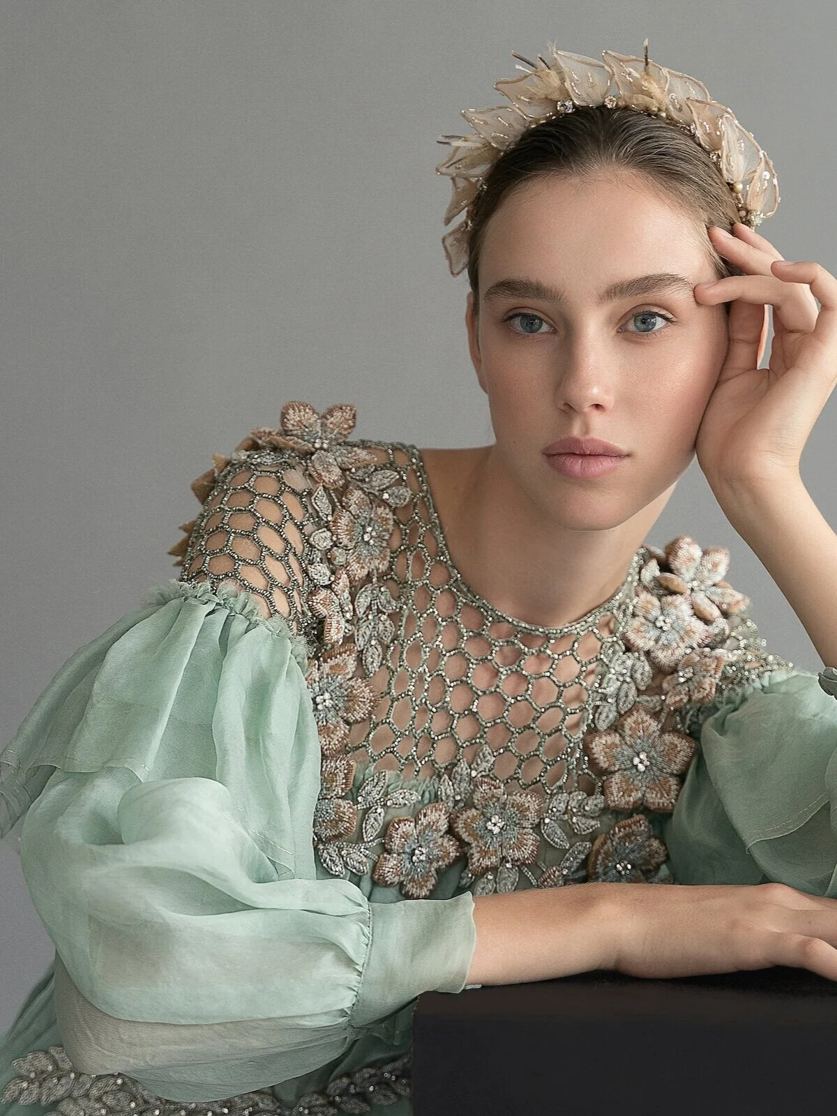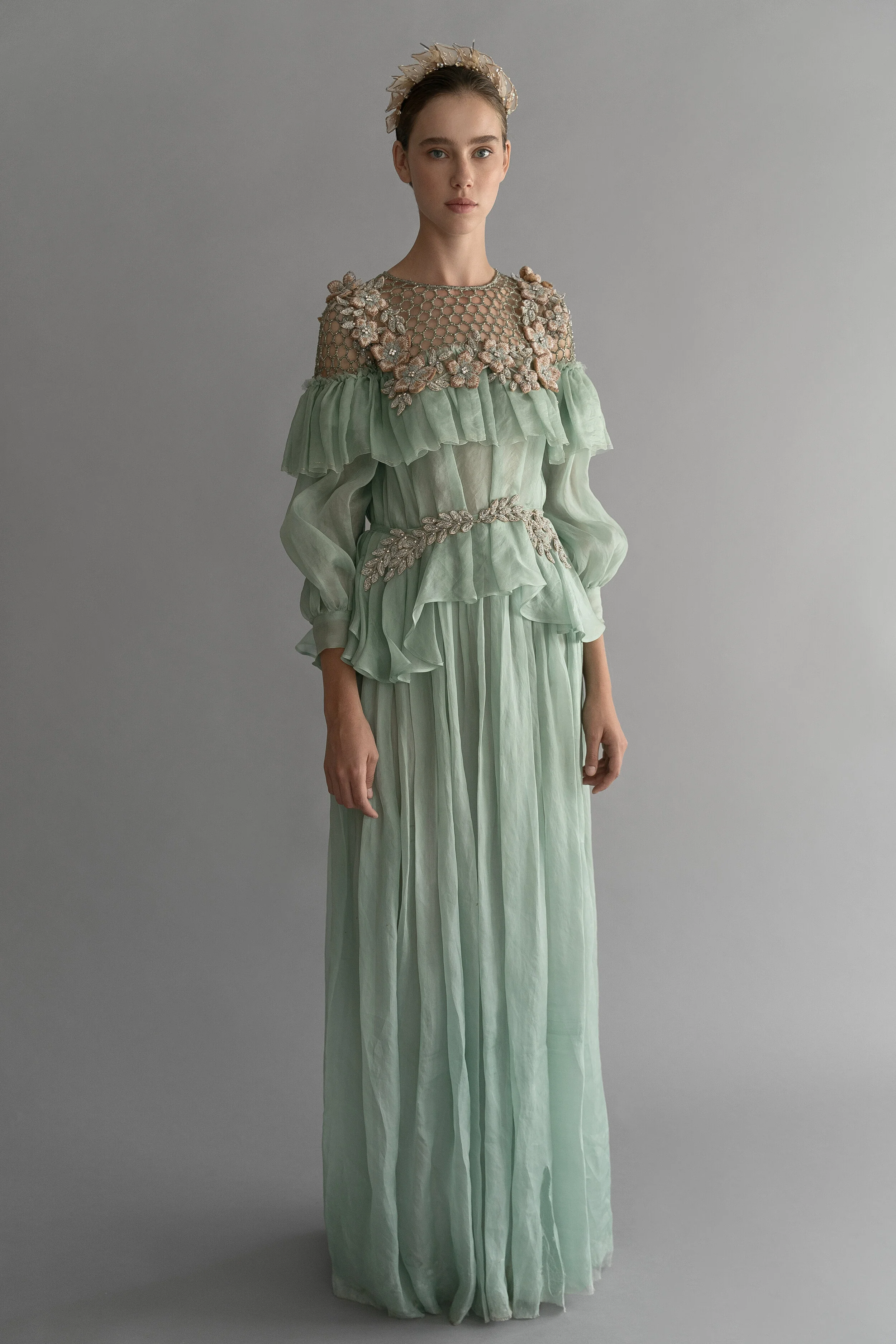 Boho style, mint colored sheath gown with long sleeves, peplum skirt, and floral details on neckline and waist.